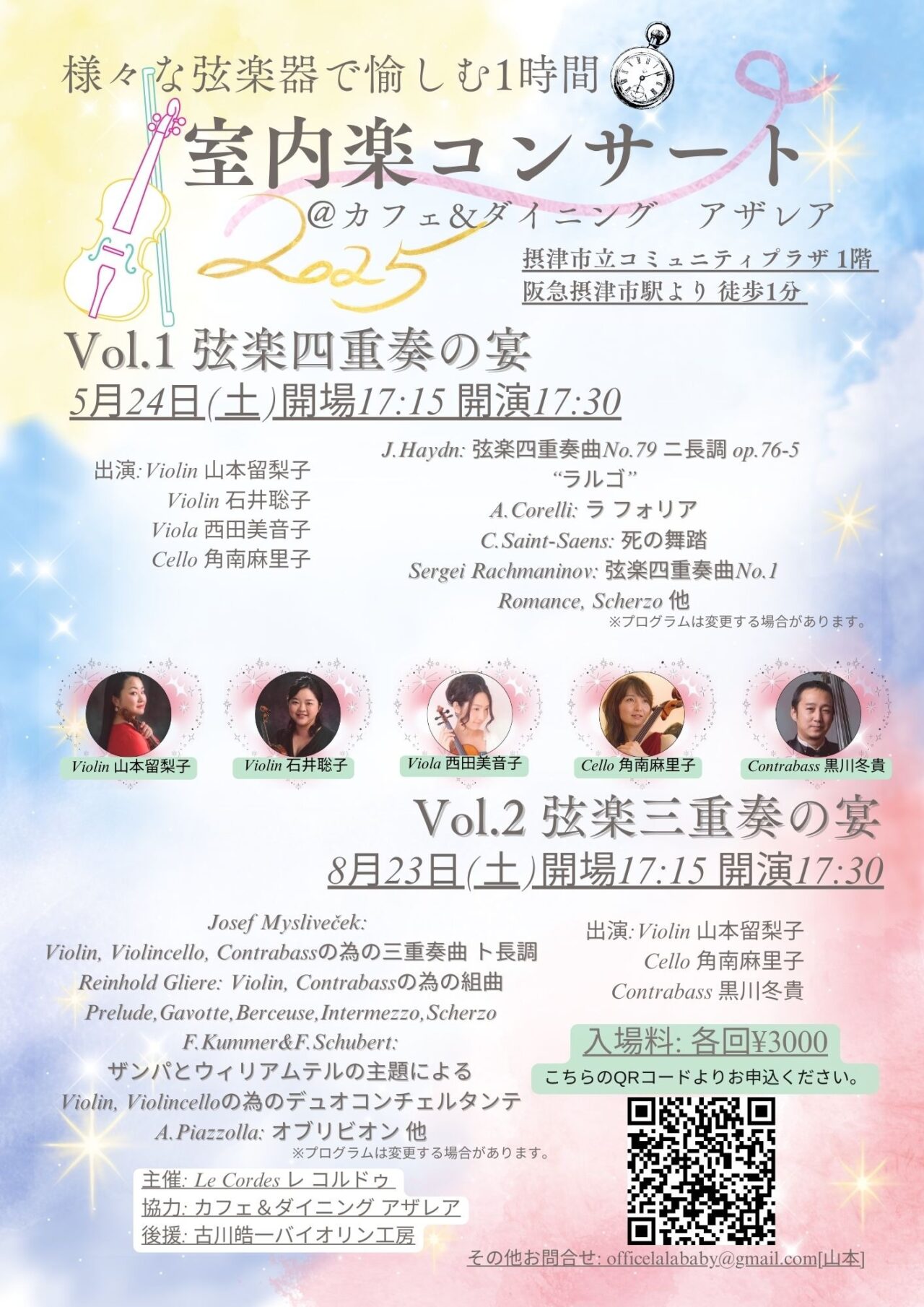 2025年5月24日(土)と、8月23日(土)に摂津市立コミュニティプラザ1階の「カフェ&ダイニング アザレア」にて、室内楽コンサート「弦楽四重奏の宴」が開催されます。