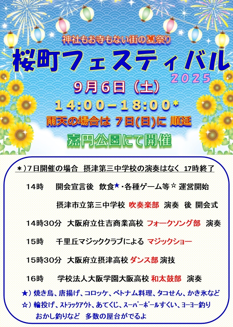 「桜町フェスティバル 2025 《神社もお寺もない街の夏祭り》」が、2025年9月6日(土)に摂津市桜町の嘉円公園にて開催されます。摂津市イベントナビ