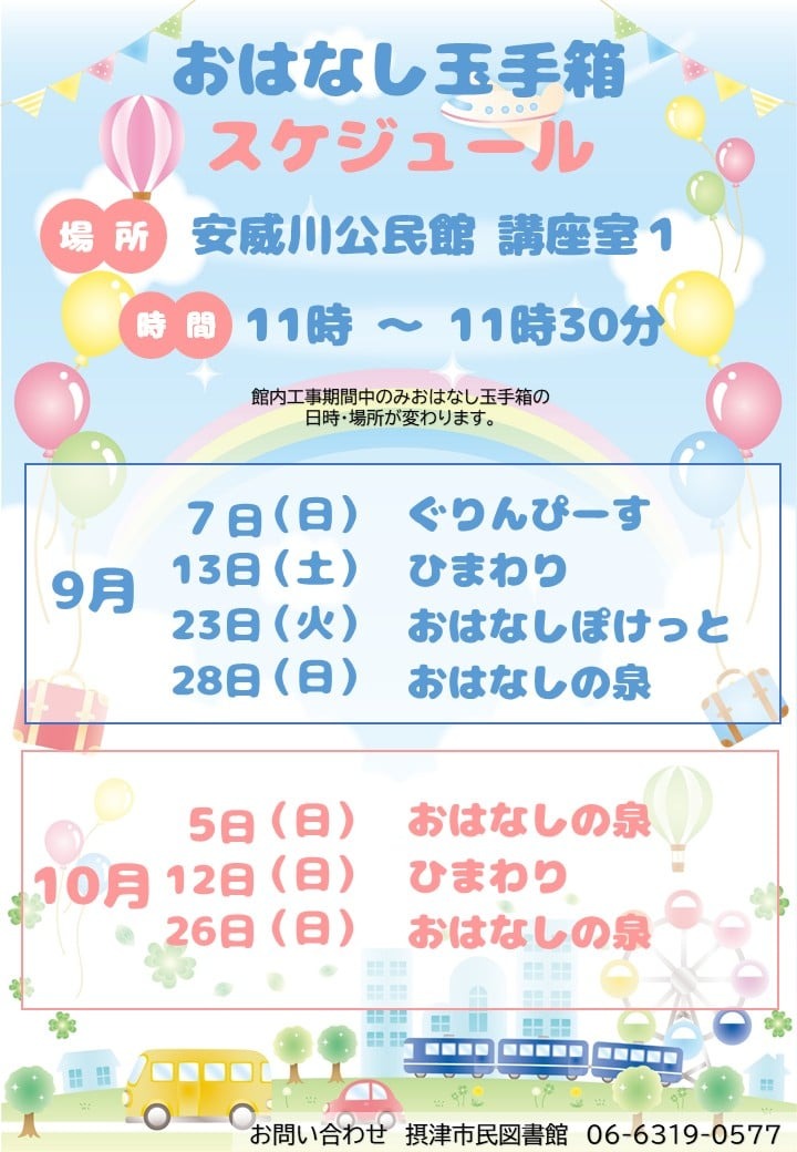 摂津市民図書館休館中は、日時・場所を変更して読み聞かせ会を行います。