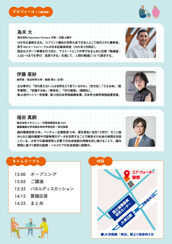 登壇するのは、日本人初のスプリント種目世界大会メダリストとして知られる為末大氏、人間の感性や美的判断の原理を探求する美学者の伊藤亜紗氏、そして腸内細菌研究の専門家でありバイオベンチャー企業経営者でもある福田真嗣氏の三名です。