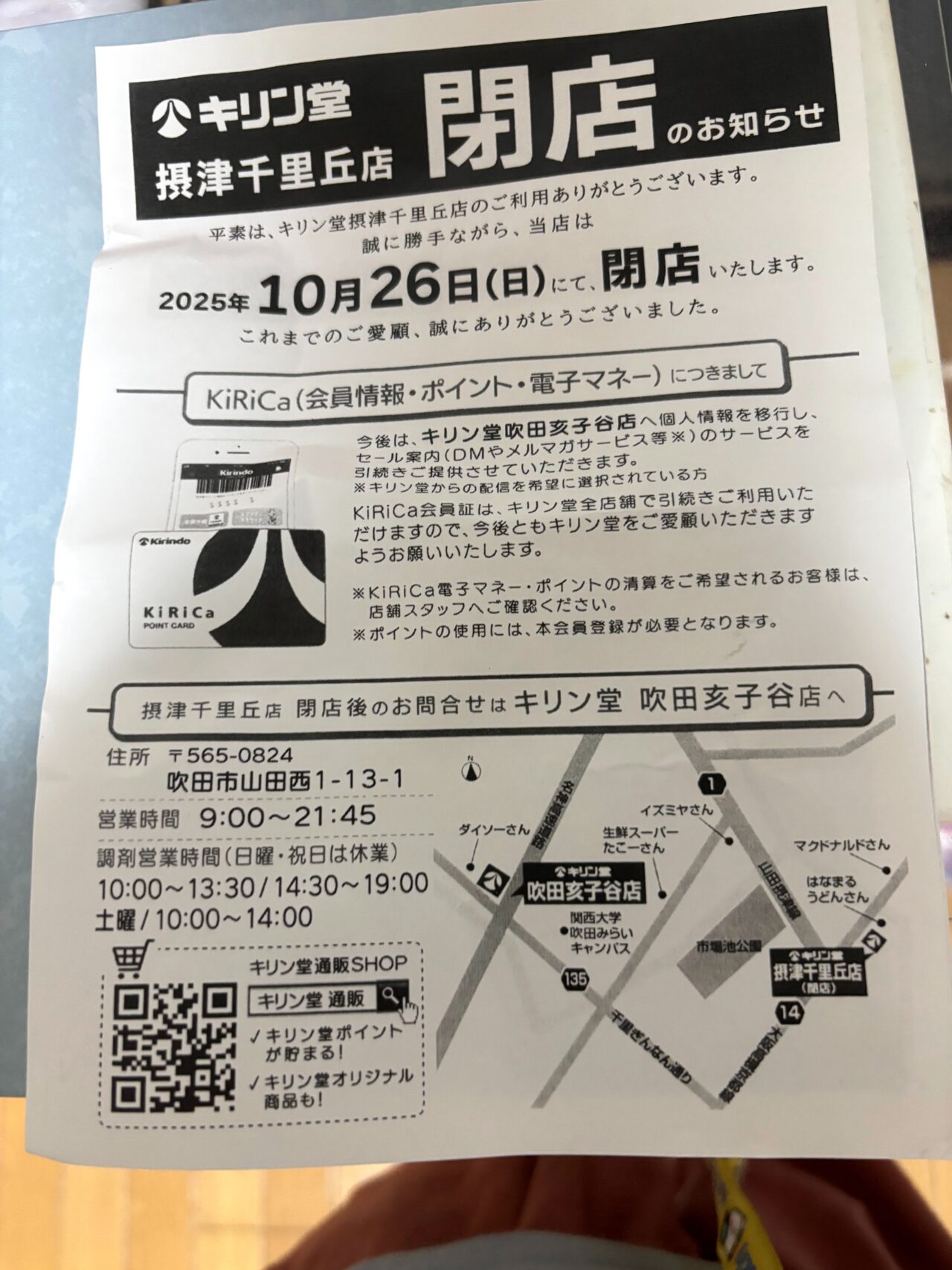長年親しまれてきた「キリン堂 摂津千里丘店」の営業終了にあたり、地域の買い物環境もひとつの節目を迎えます。