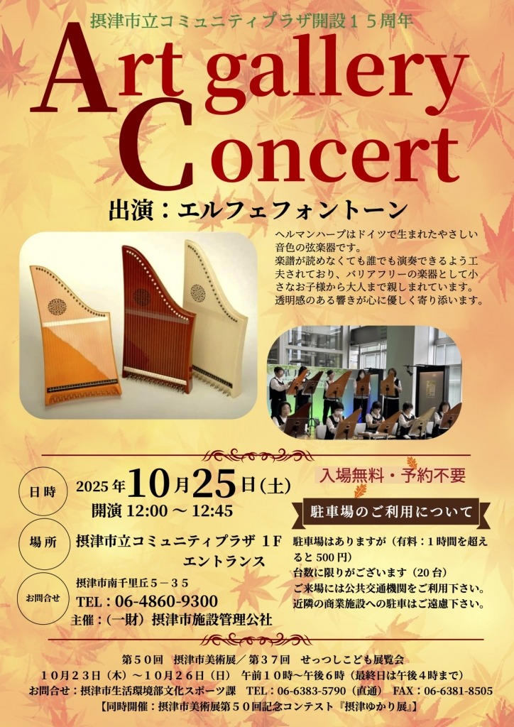 摂津市立コミュニティプラザでは、開設15周年を記念した「アートギャラリーコンサート」が2025年10月25日(土)に行われます。