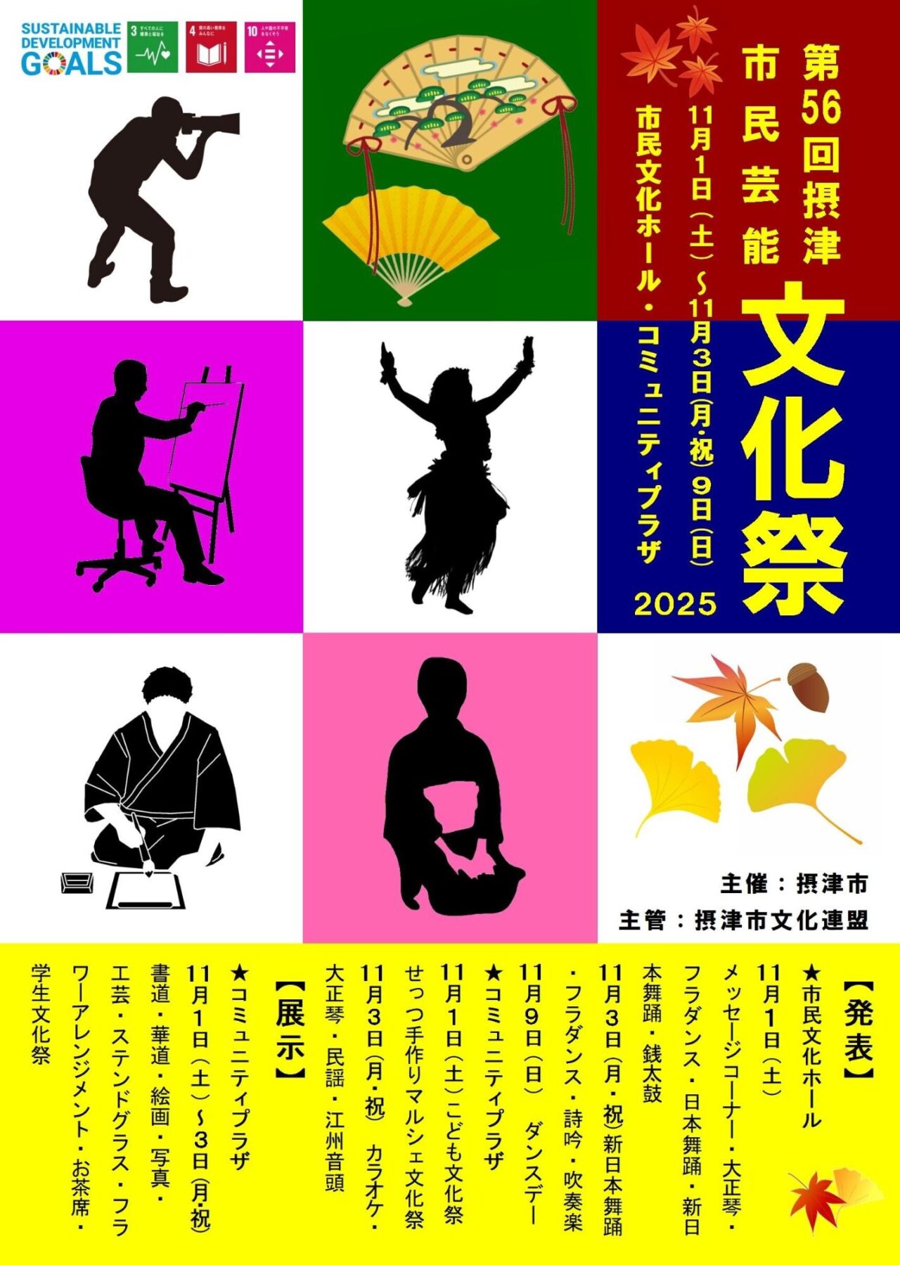 2025年11月1日(土)から3日(月・祝)、そして9日(日)にかけて、「第56回摂津市民芸能文化祭」が開催されます。会場は摂津市民文化ホールと摂津市立コミュニティプラザで、入場は無料です。