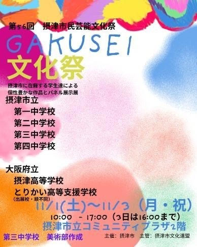 摂津市内の学生たちによる個性あふれる作品展示が行われます。摂津市立第一中学校、第二中学校、第三中学校、第四中学校、大阪府立摂津高等学校、大阪府立とりかい高等支援学校の生徒たちによる力作をご覧いただけます。