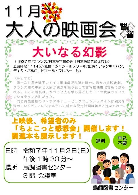 【摂津市】鳥飼図書センターでは毎週映画が無料で観られます【11月編】「大いなる幻影 」ほか