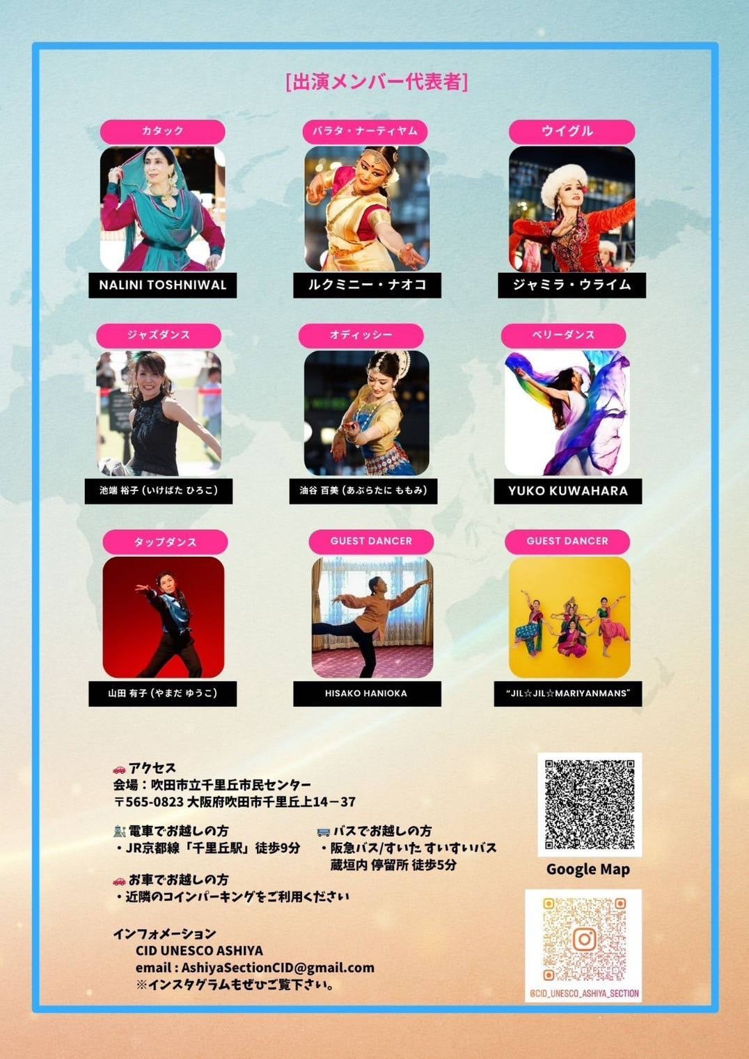 CID(International Dance Council/国際ダンス協議会)は、ユネスコが世界150か国規模で展開するダンス普及団体です。芦屋セクションは代表ナリニ・トシュニワル氏が日本で設立し、関西のプロダンサーを中心に活動しています。ダンスを通して世界の文化と平和をつなぐのが目的です。