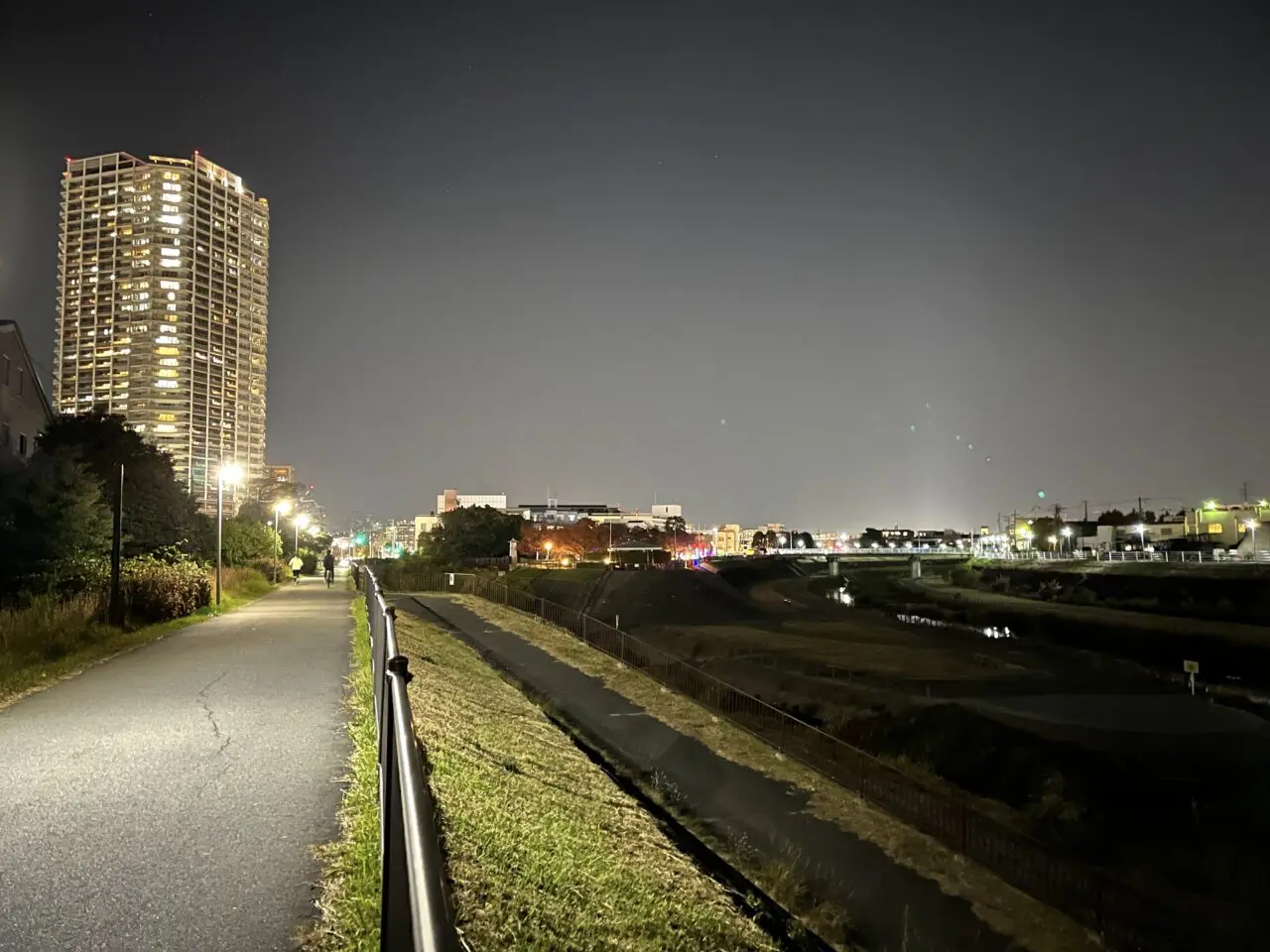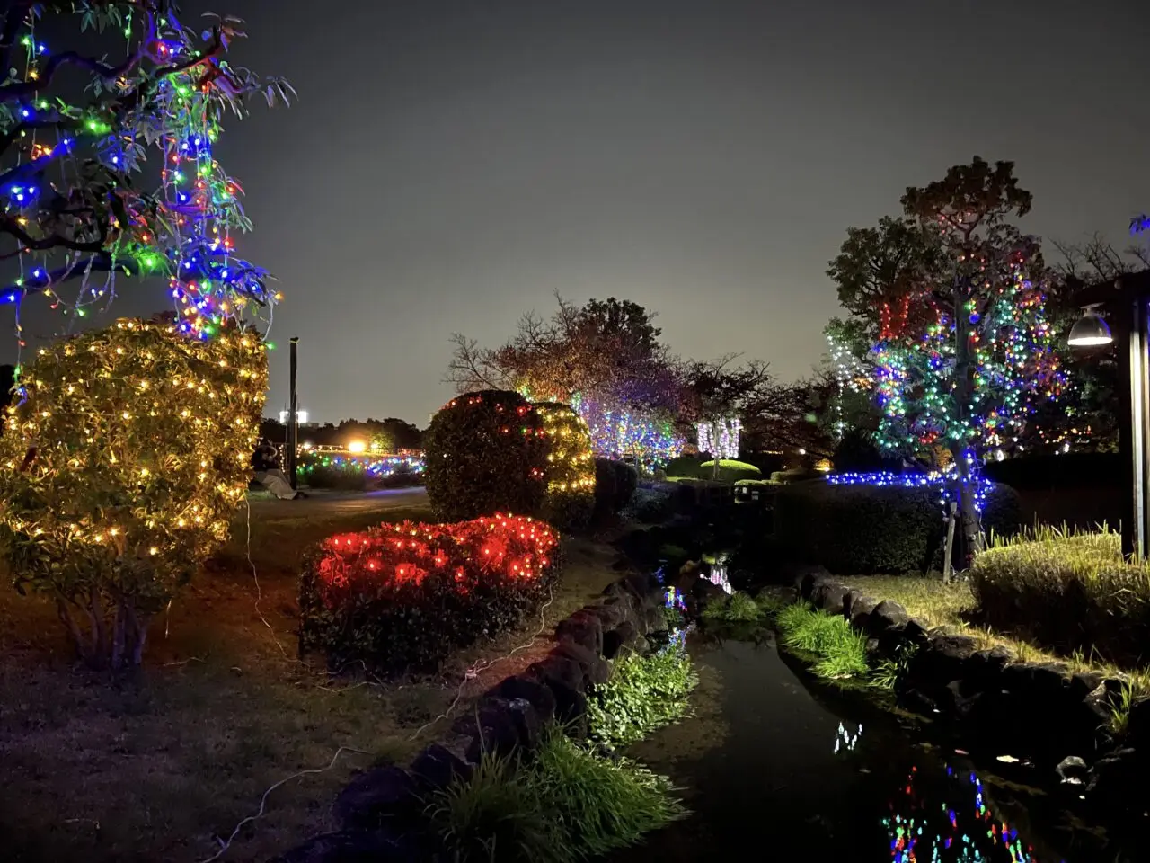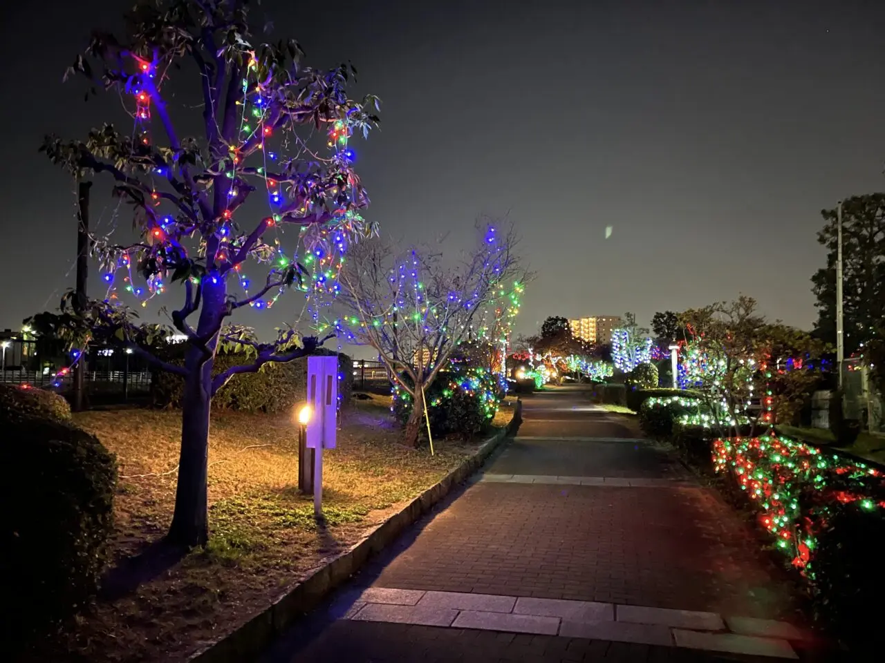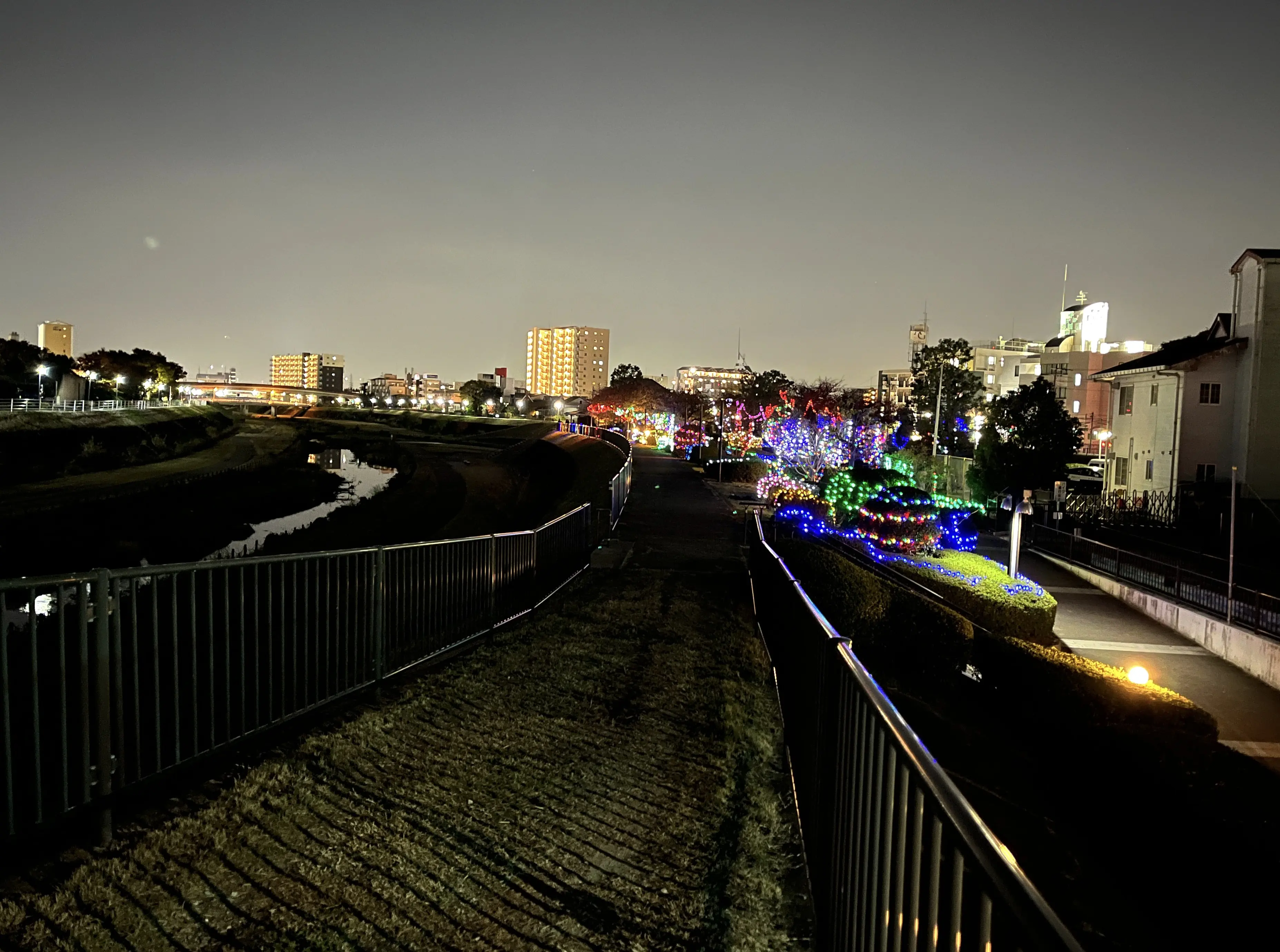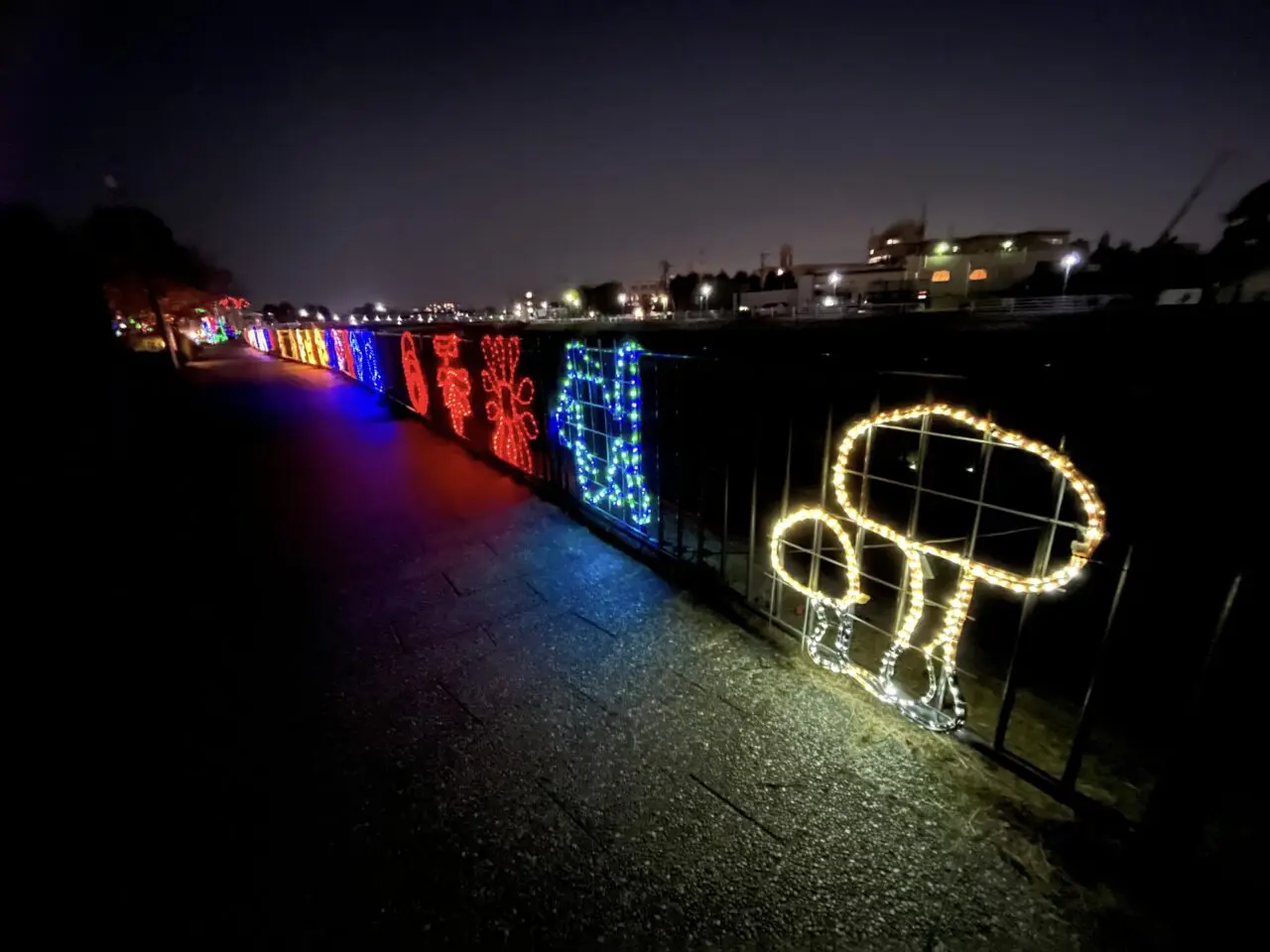 大正川沿いの遊歩道は、日中の散歩コースとしても人気がありますが、イルミネーションの点灯期間中は夕暮れ時からの散策もおすすめです