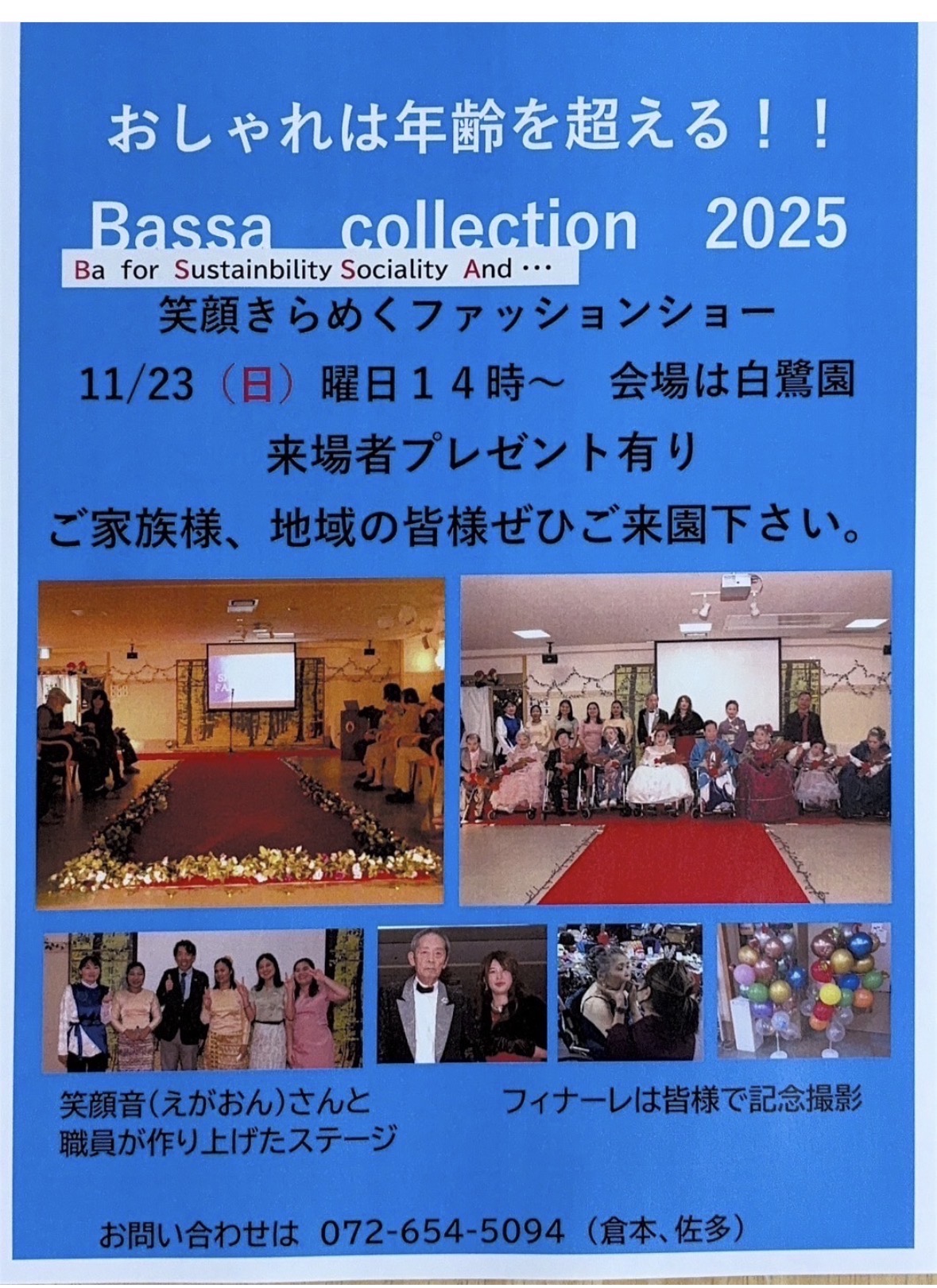 2025年11月23日(日)、摂津市にある社会福祉法人桃林会 とりかい白鷺園にて、「笑顔きらめくファッションショー Bassa collection 2025」が開催されました。「Ba for Sustainbility Sociality And…」をテーマに掲げ、「おしゃれは年齢を超える!!」というメッセージのもと、会場は多くの笑顔で包まれました。