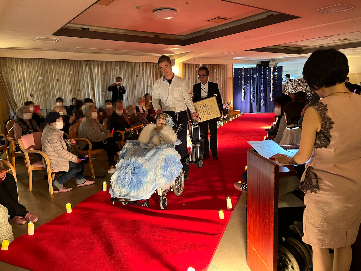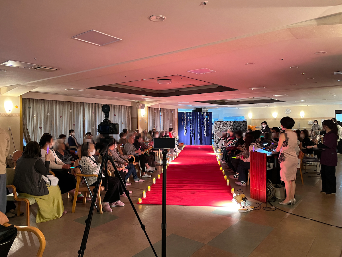 会場となった白鷺園の特設ランウェイには、職員さんが協力して作り上げたステージが設けられ、華やかな雰囲気に彩られていました。