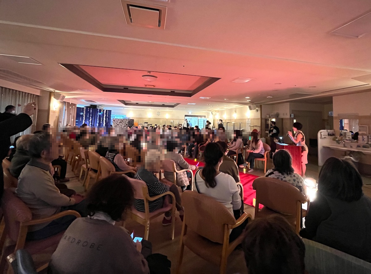 午後2時から始まったこのファッションショーには、施設を利用されている方々をはじめ、ご家族、地域の皆さまなど、約70名が参加されました。