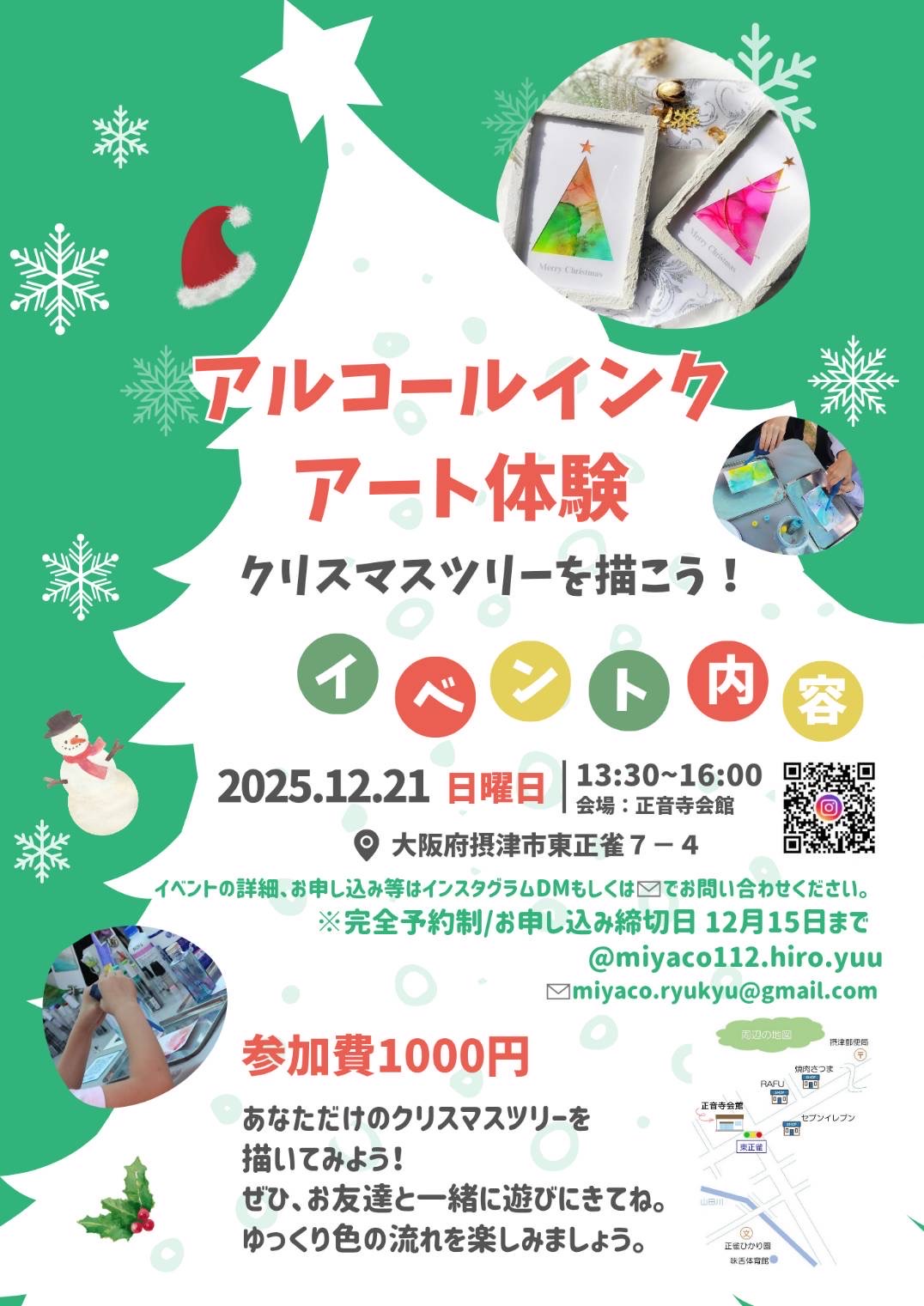 摂津市東正雀にある正音寺会館では、2025年12月21日(日)に「アルコールインクアート体験」が開催されます。アルコールインクならではの色のにじみや偶然生まれる模様を楽しめるワークショップで、クリスマスツリーのアートがテーマです。