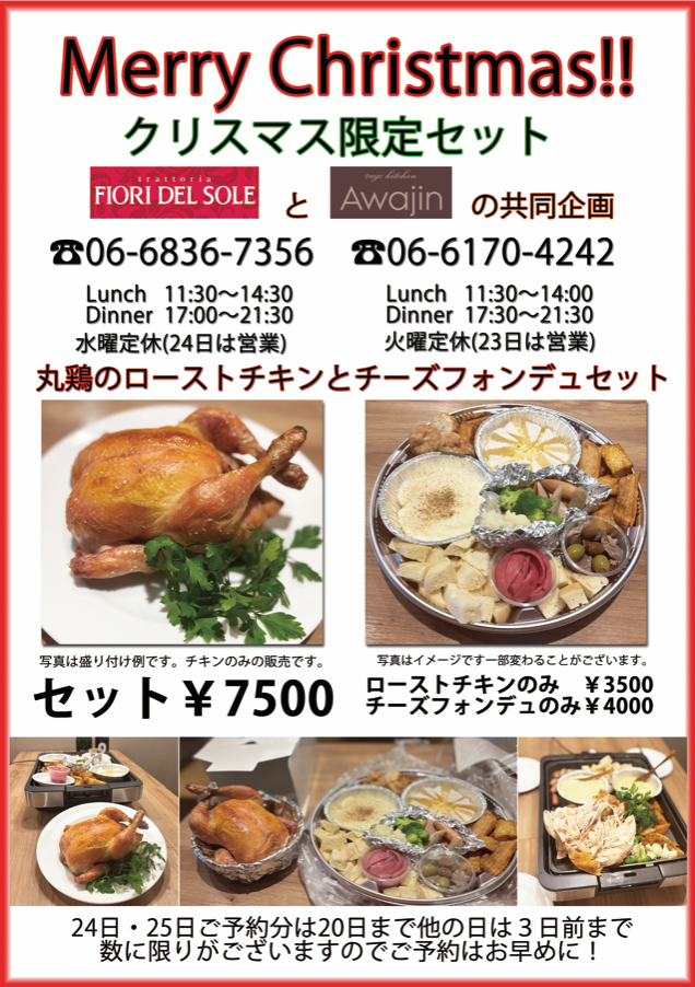 摂津市で人気のイタリアンレストラン「FIORI DEL SOLE(フィオーリ デル ソーレ)」と「Awajin(アワジン)」が、今年もクリスマス限定の特別セットを共同企画として提供します。