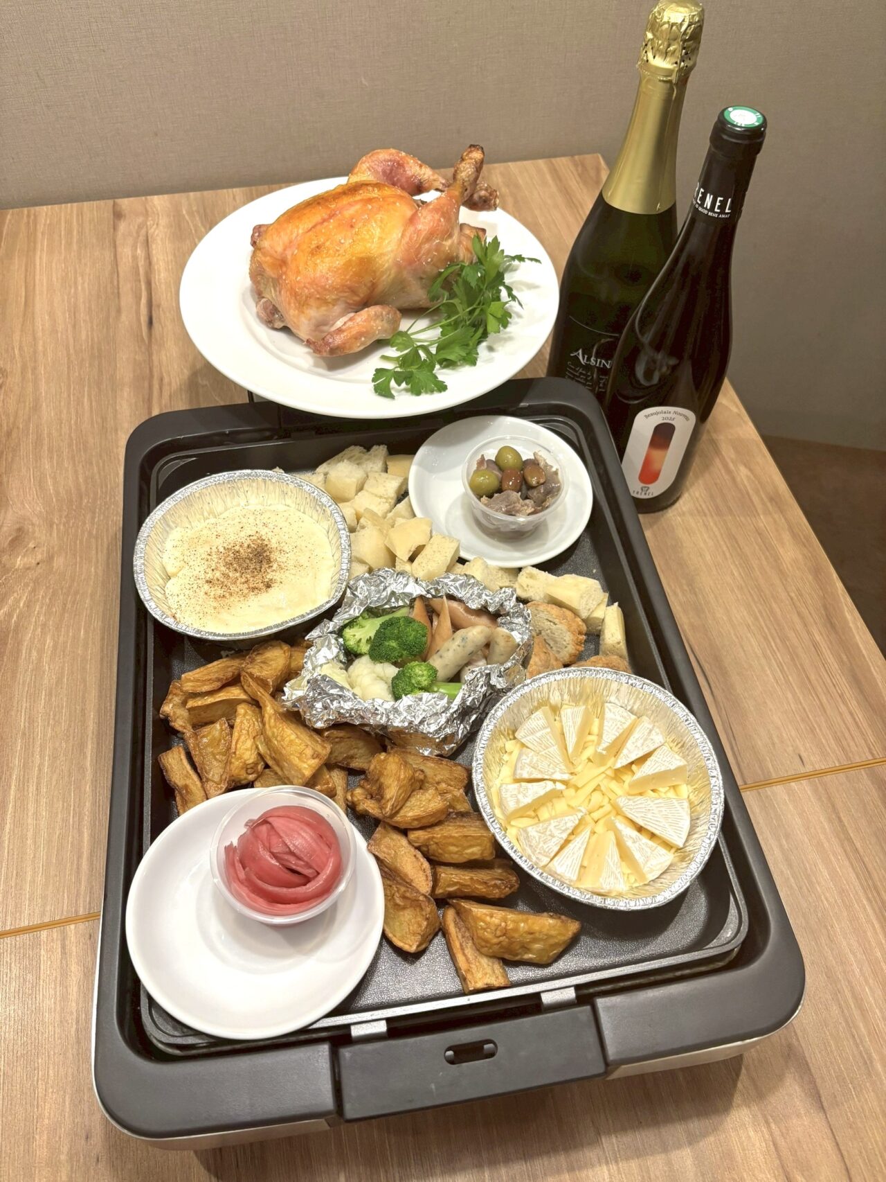 チーズフォンデュは、ホットプレートで簡単に、お手軽に楽しめるのが嬉しいポイント。野菜やパンをチーズに絡めながら、ワインと一緒に楽しむクリスマスディナーは格別ですね。
