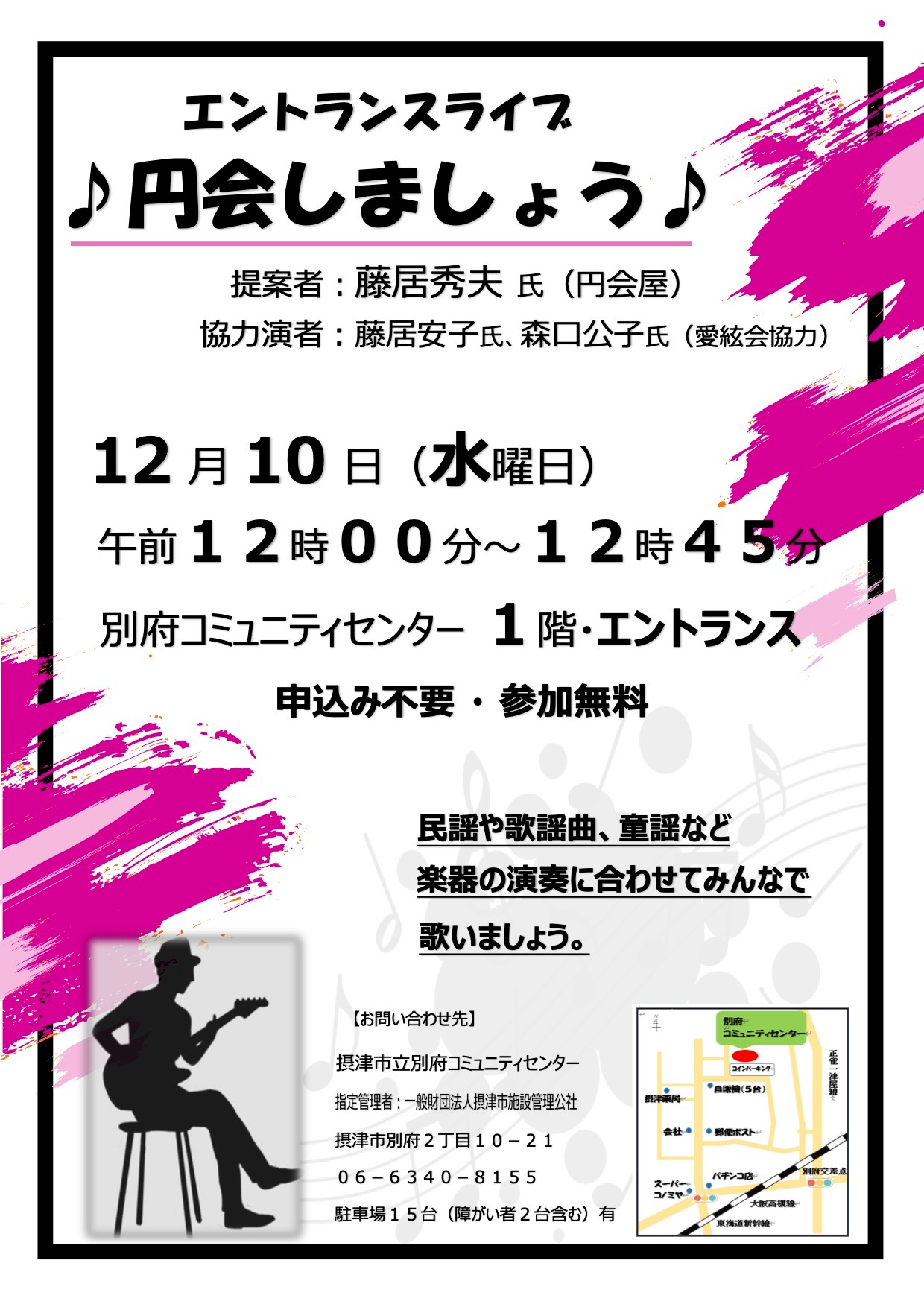摂津市立別府コミュニティセンターにて、12月10日(水)に「エントランスライブ『円会しましょう』」が開催されます。