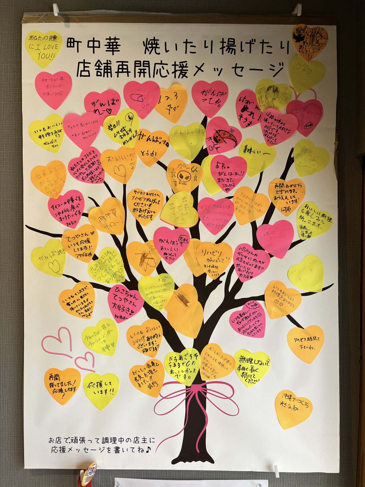 レジ後ろの壁には店舗再開応援メッセージが貼られていました