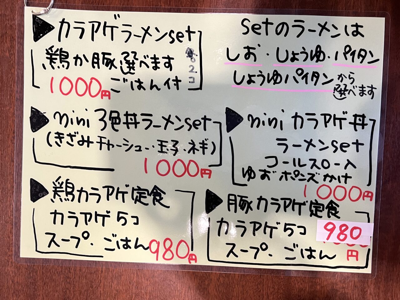 今回は「miniカラアゲ丼ラーメンset」(1,000円)を注文。ラーメンは「しお」「しょうゆ」「パイタン」「しょうゆパイタン」の4種類から選べ、奥さんのお勧めである「しょうゆパイタン」をチョイスしました。