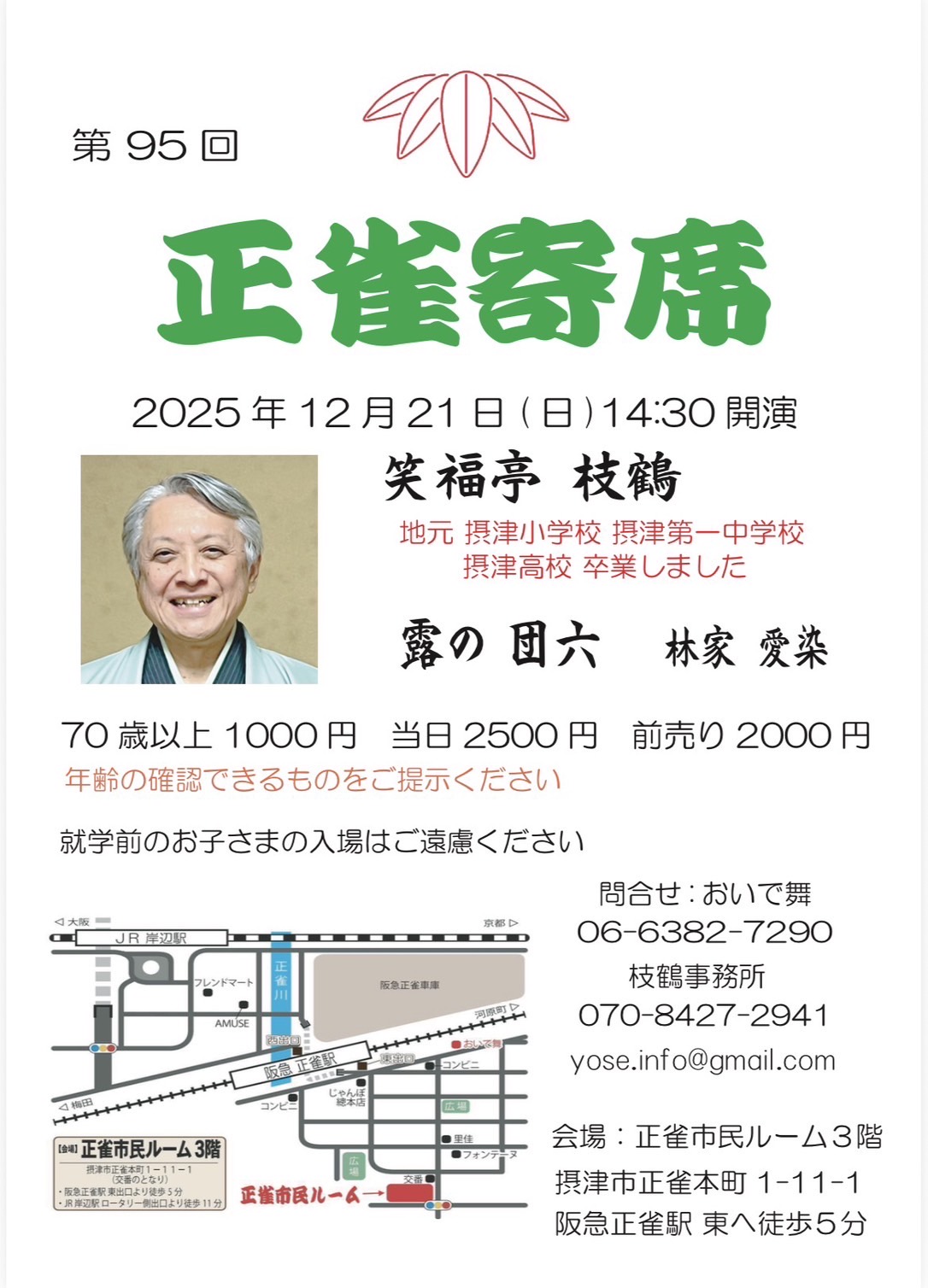 2025年12月21日(日)、正雀市民ルームで「第95回 正雀寄席」が開催されます。地元ゆかりの落語家・笑福亭枝鶴さんが中心となる会で、高齢の方にも参加しやすい料金設定が特徴です。