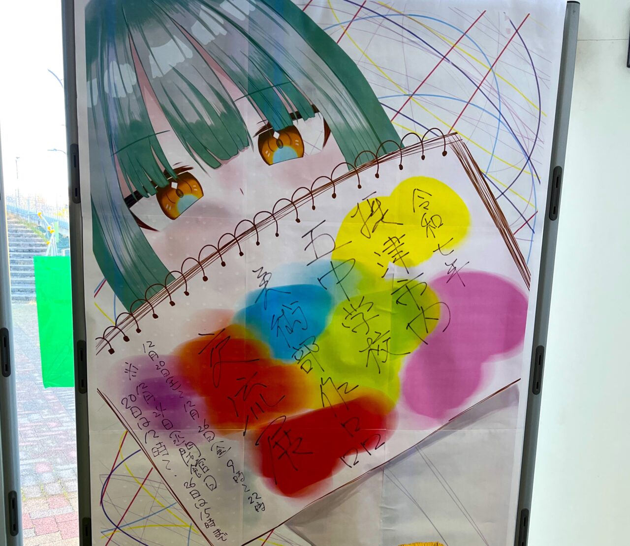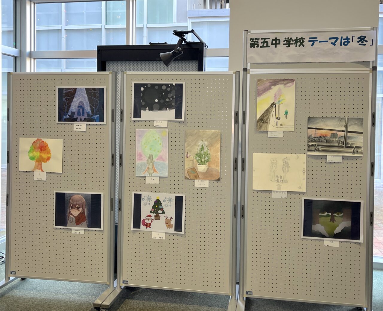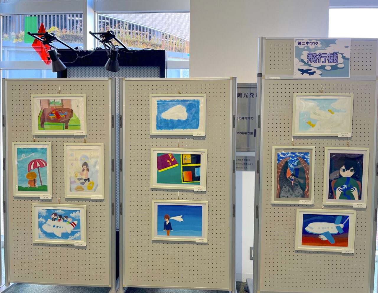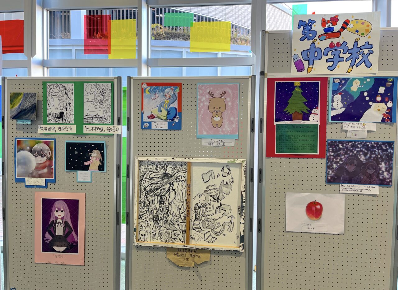 会場となるエントランスには、色彩豊かなイラストやポスター作品、デザイン性の高い制作物などが並び、中学生ならではの感性や発想を間近に感じることができます。