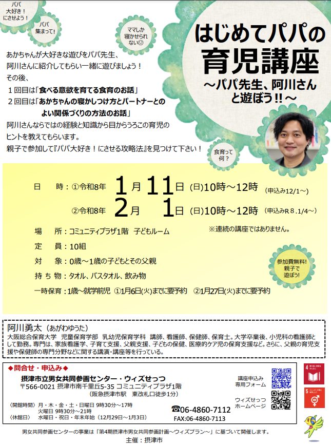摂津市立男女共同参画センター・ウィズせっつでは、0歳~1歳のお子さんとそのお父さんを対象とした「はじめてパパの育児講座~パパ先生、阿川さんと遊ぼう‼~」を開催します。