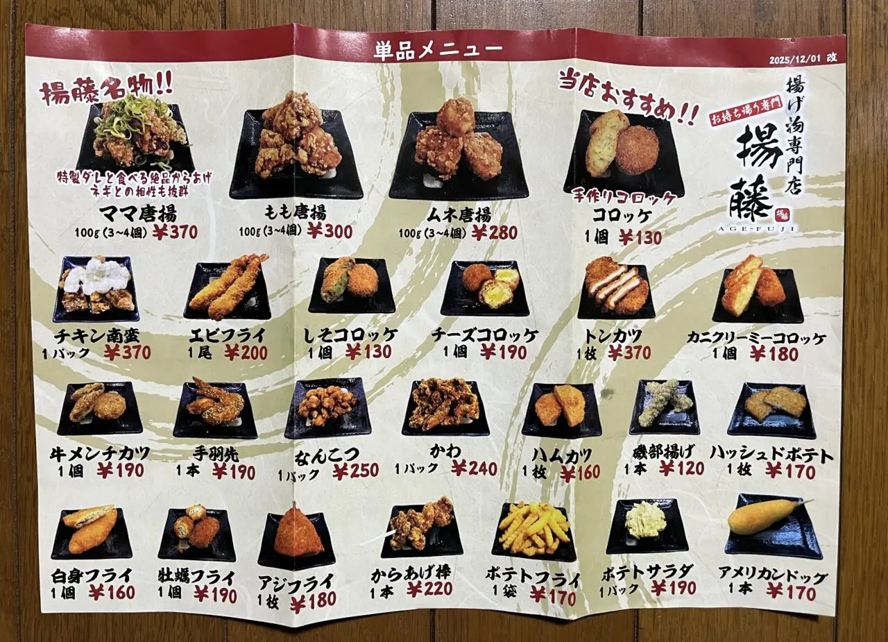 摂津市鳥飼エリアで揚げ物をお探しの際は、「揚藤」が選択肢の一つとなるでしょう。手頃な価格設定と豊富なメニューで、様々なニーズに対応できるお店です。