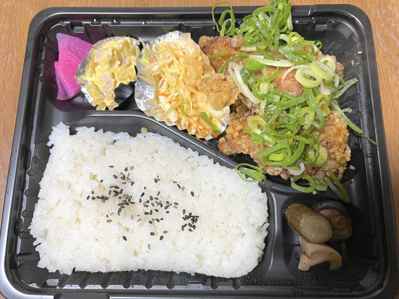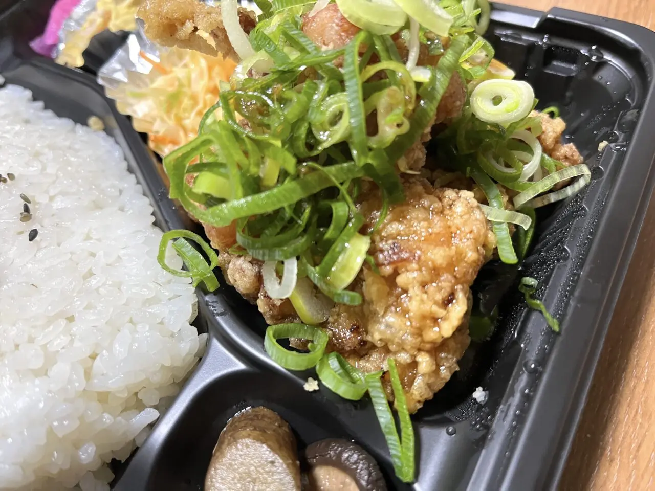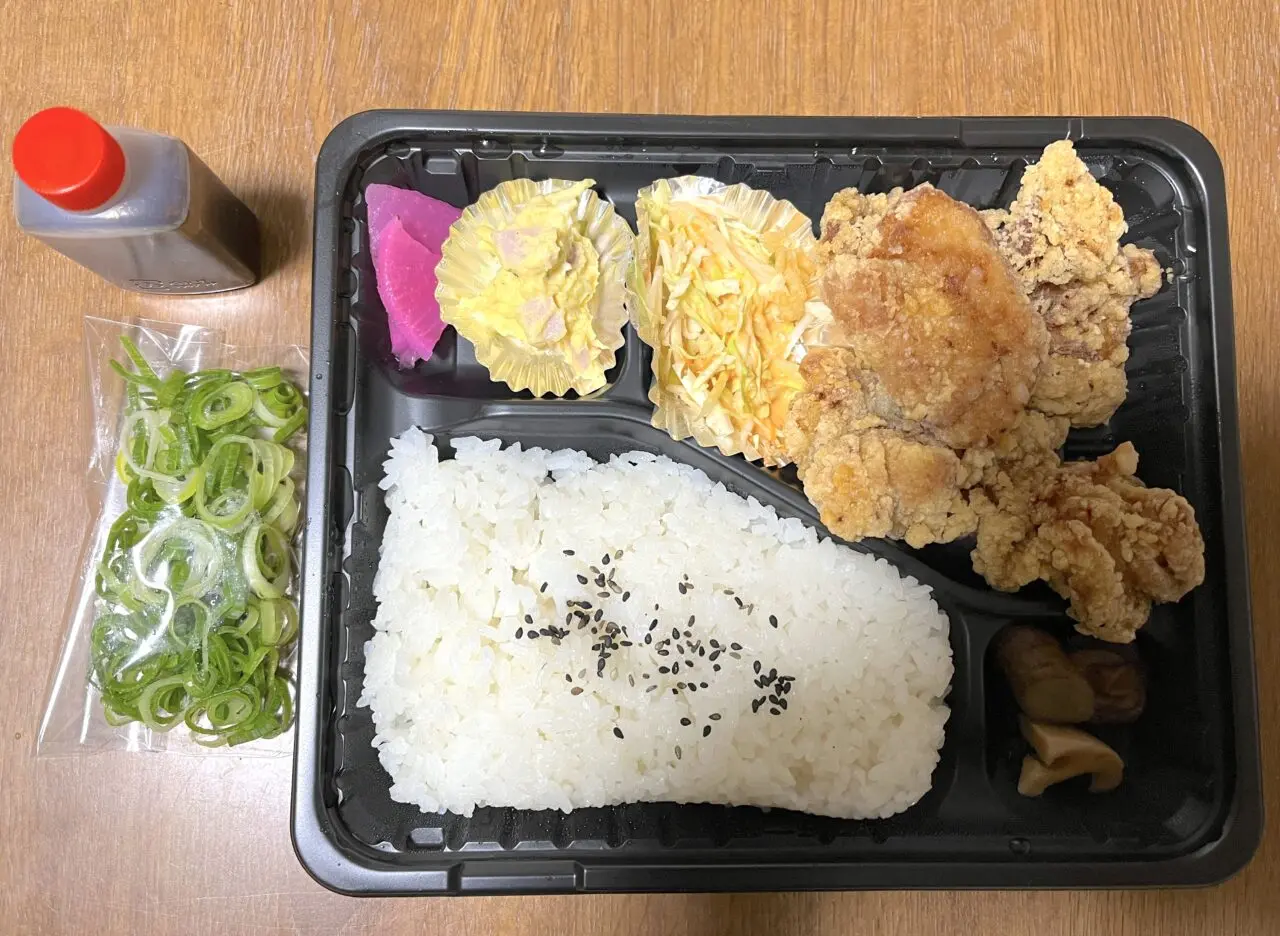 お弁当は、ママ唐揚弁当を700円で注文しました。このお弁当には自家製のタレとネギが別添えされており、店員さんから「よく混ぜてください」とアドバイスをいただきました。