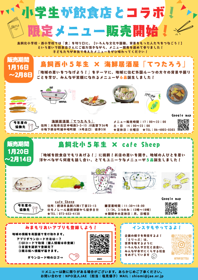 鳥飼北小学校と鳥飼西小学校の5年生が、地域の飲食店とコラボレーションし、期間限定メニューの開発に挑戦しています。これは、多文化共生プロジェクト「とりっぷ」の一環として実施されているもので、子どもたちが地域の多様な背景を持つ人たちのことを学びながら、「みんなが幸せにくらせる社会」について考えるプロジェクトです。