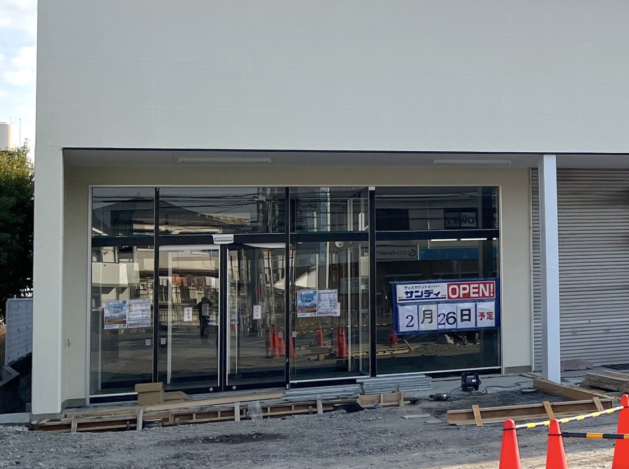 入口付近には「ディスカウントスーパー サンディ OPEN! 2月26日予定」という貼り紙が掲出されており、オープンに向けて着々と準備が進められている様子です。