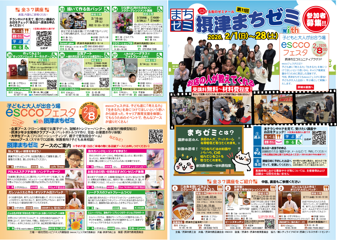 2026年2月は、摂津市でお店の人から直接学べる「摂津まちゼミ」と、子どもたちのキャリア教育を支援する「esccoフェスタ」が開催される、学びと体験の充実した1ヶ月となります。
