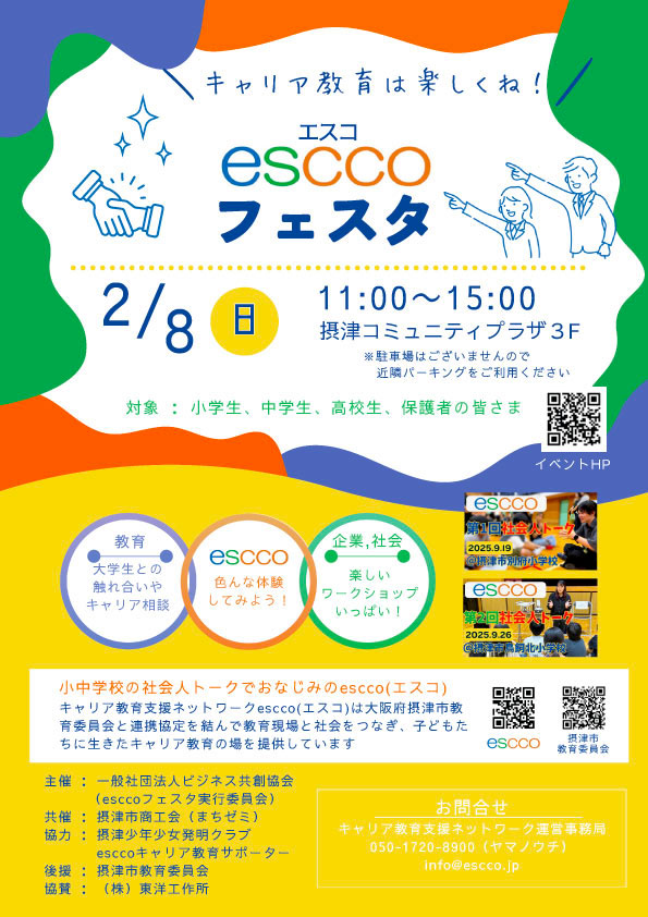 「escco(エスコ)」は、キャリア教育支援ネットワークで、大阪府摂津市の「学校・企業・地域協定」を軸にした教育活動と社会参画を推進している団体です。