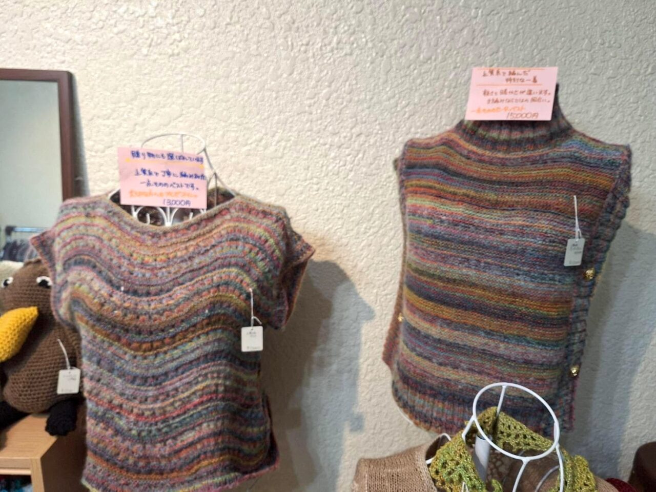店内には、今の季節にぴったりの暖かい帽子やネックウォーマー、ベストやセーターなどが並び、贈り物としても喜ばれそうな品々が揃っています。さらに、ワンちゃんのお洋服コーナーも用意されているとのことです。