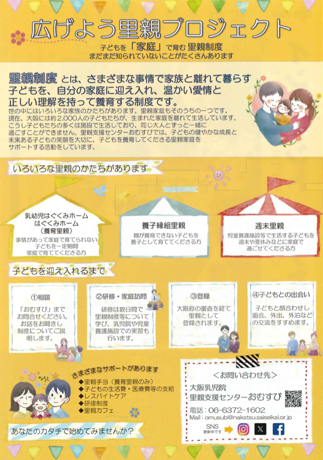 主催は「里親支援センター おむすび」。同センターは大阪府の委託を受け、里親制度の普及啓発や里親家庭への支援活動を行っています。里親に関する相談や研修、交流会の開催など、里親になりたい方や現在里親として活動されている方をサポートしています。