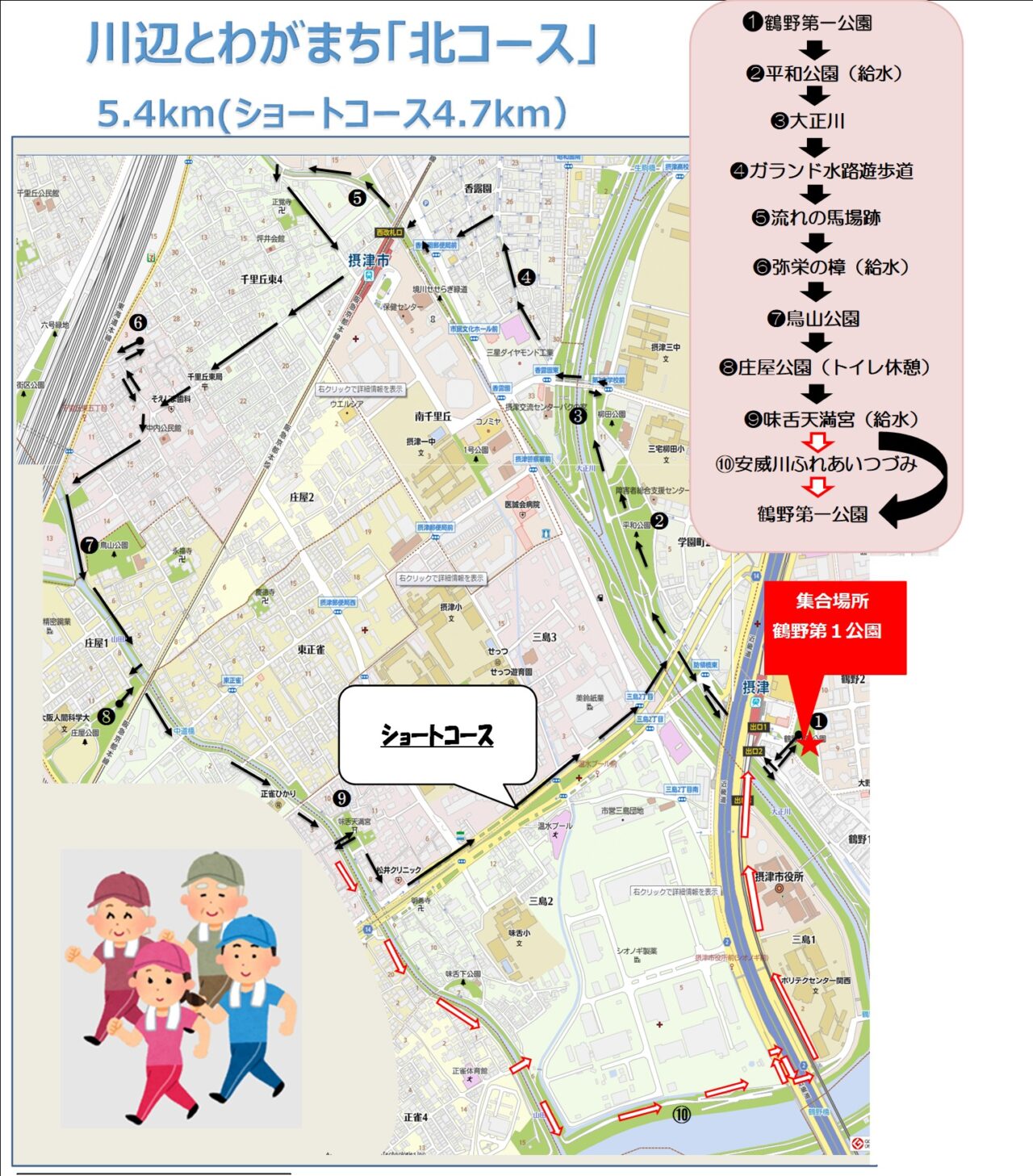 コースは鶴野第一公園を出発し、平和公園(給水)、大正川、ガランド水路遊歩道、流れの馬場跡、弥栄の樟(給水)、鳥山公園、庄屋公園(トイレ休憩)、味舌天満宮(給水)、安威川ふれあいつづみを経由して、再び鶴野第一公園へ戻る周回ルートとなっています。