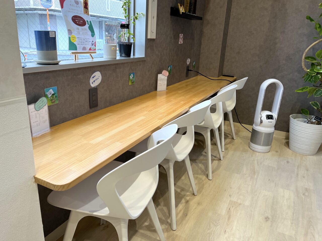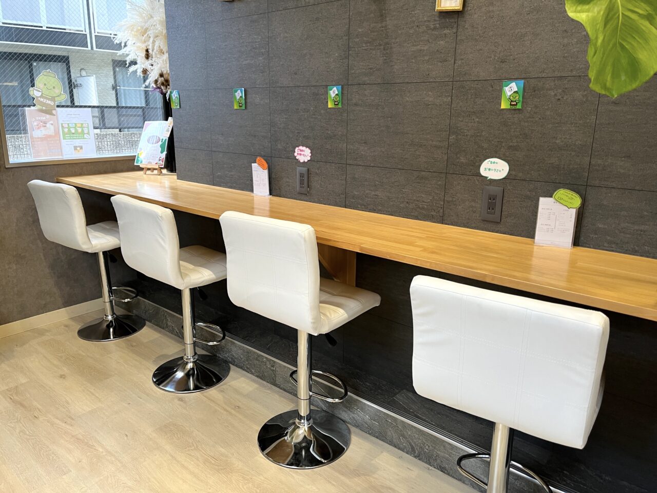 座席はカウンター席のみの8席というコンパクトな構成ですが、5箇所にコンセントが用意されており、仕事や勉強での利用にも便利な環境が整っています。