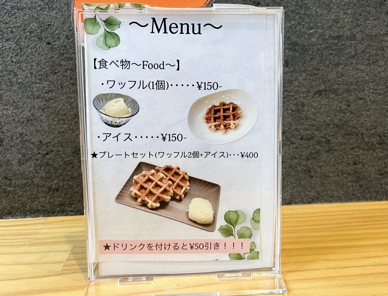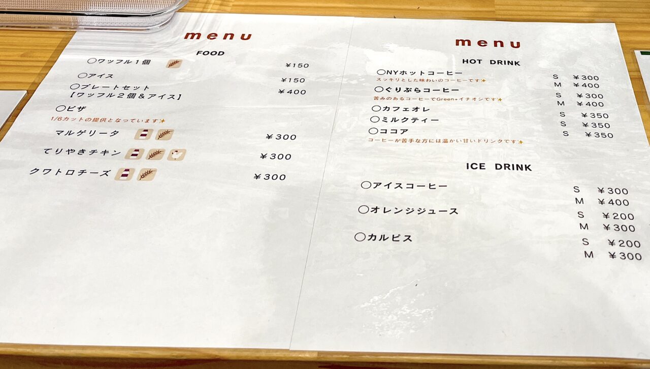 ドリンクメニューは、ホットドリンクとアイスドリンクが用意されています。ホットドリンクには、スッキリとした味わいの「NYホットコーヒー」、苦味のある「ぐりぷらコーヒー」のほか、カフェオレ、ミルクティー、ココアが揃っています。アイスドリンクには、アイスコーヒー、オレンジジュース、カルピスがあります。フードメニューは、ワッフルやアイス、ピザ(マルゲリータ、てりやきチキン、クワトロチーズ)などが楽しめます。