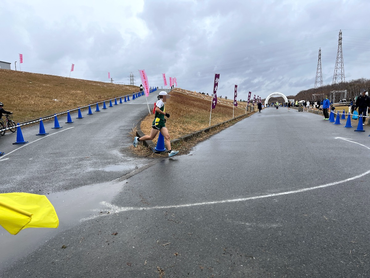 5kmと10kmの種目は、土手からヘアピンカーブを駆け下ります。カーブ付近には水溜りも!