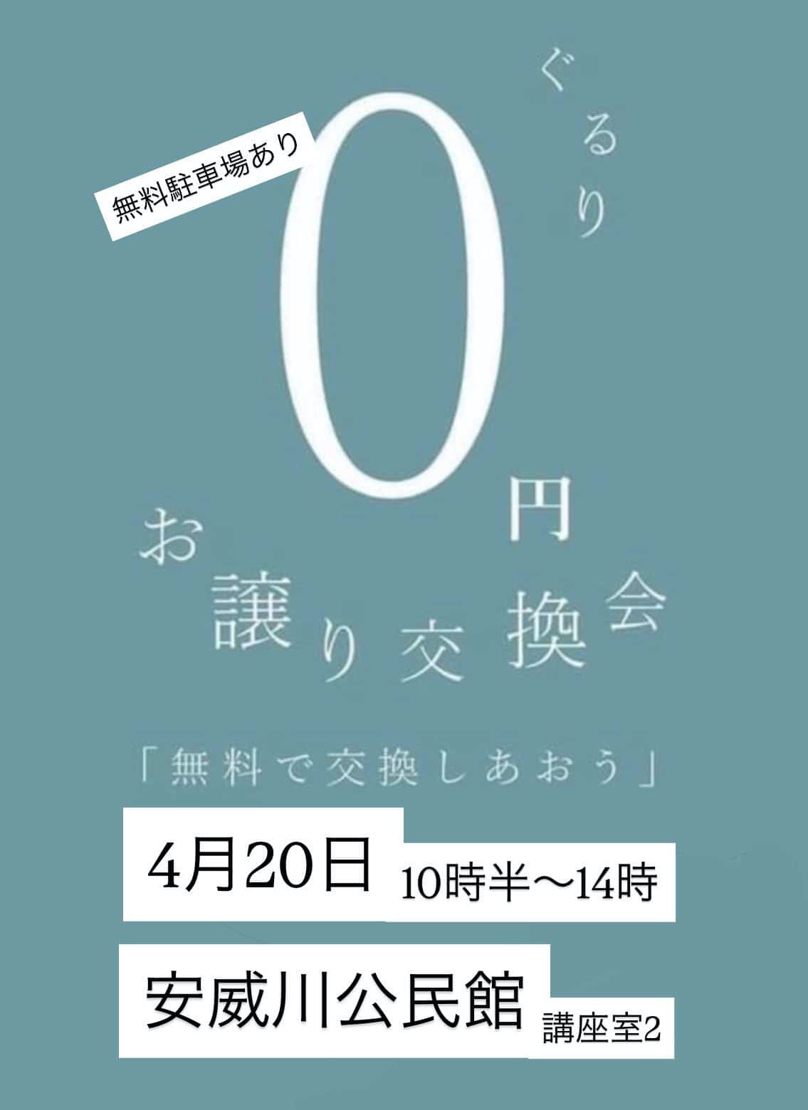 安威川公民館で、不要になった品物を次の人へつなぐ「ぐるり0円交換会」が2026年4月20日(月)に開催されます。会場は安威川公民館・講座室2で、時間は10時半から14時までです。