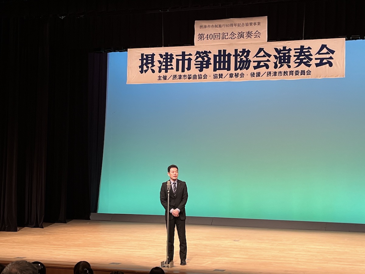 摂津市邦楽連盟・摂津市箏曲協会の名誉顧問でもある摂津市議会議員の藤浦雅彦氏も登壇し、ご挨拶がありました。