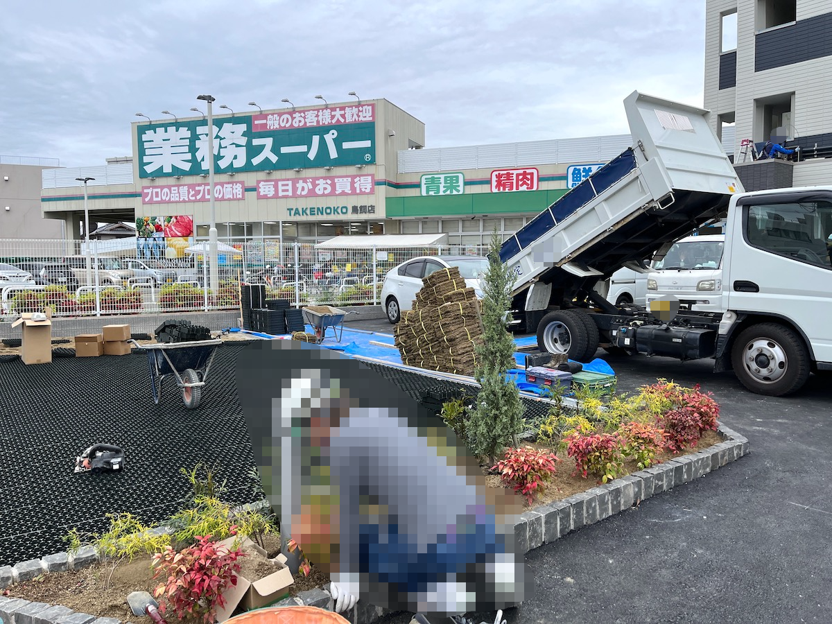 現地では賃貸マンションの建設工事が進んでおり、作業員の方が外構・植栽の施工を行っている様子が見られました。