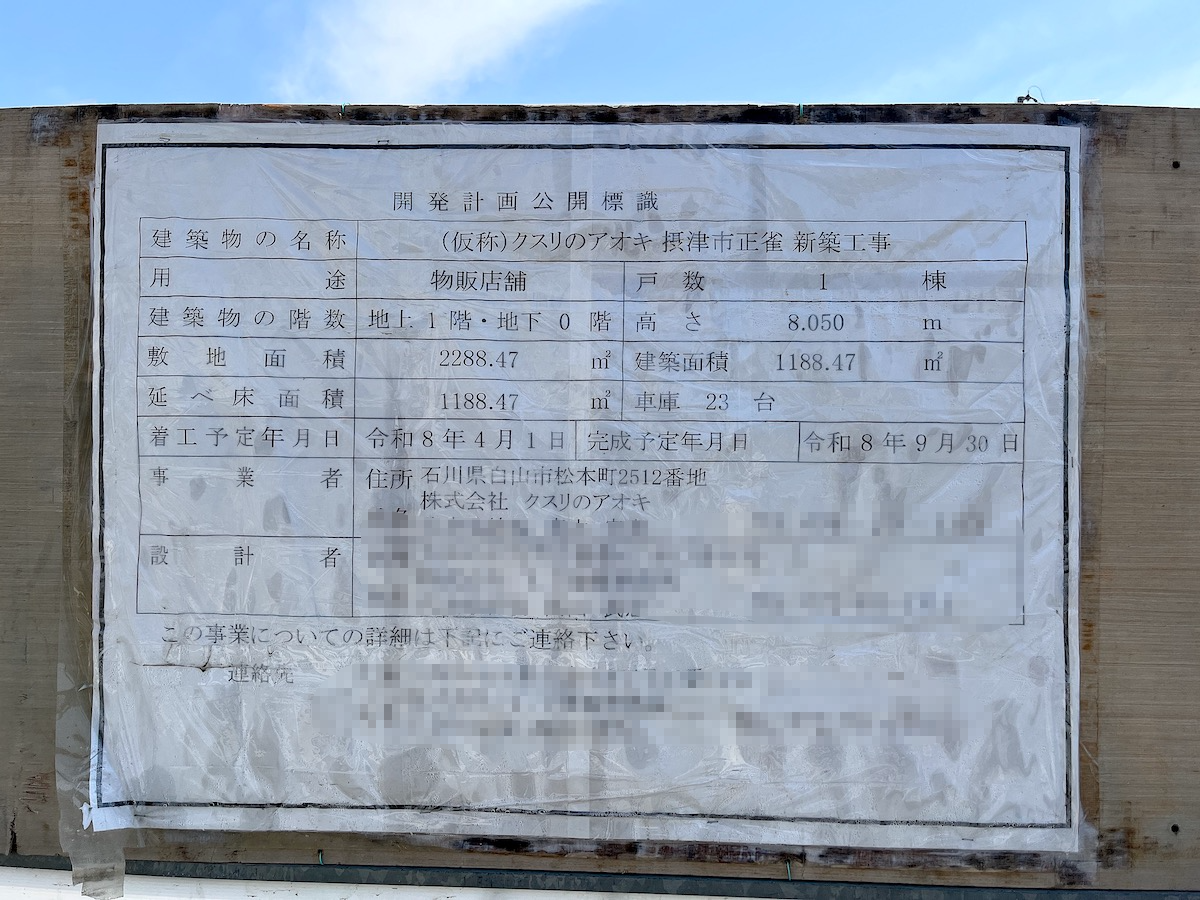 現地の仮囲いには「開発計画公開標識」が掲示されており、建築物の名称は「(仮称)クスリのアオキ 摂津市正雀 新築工事」と記されています。